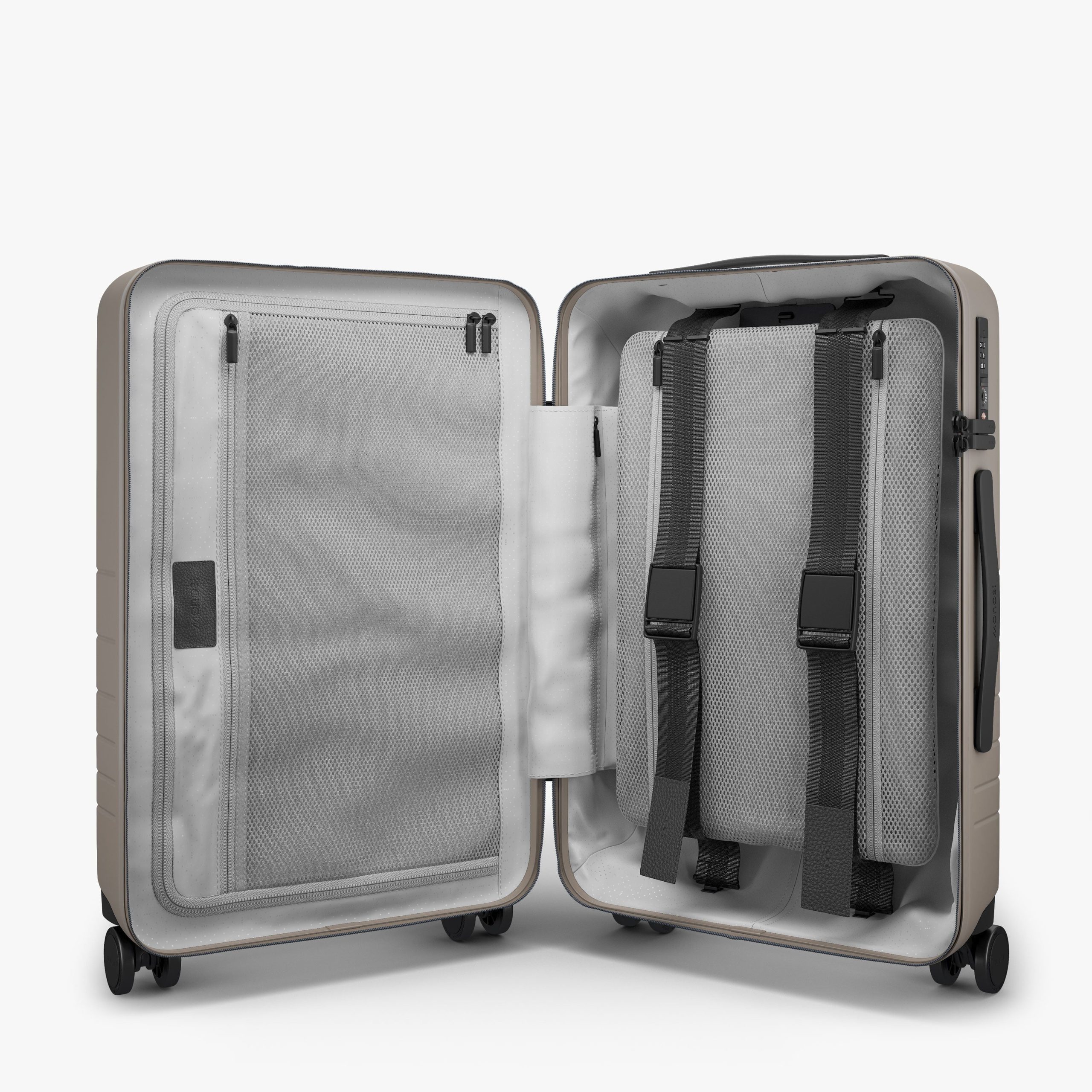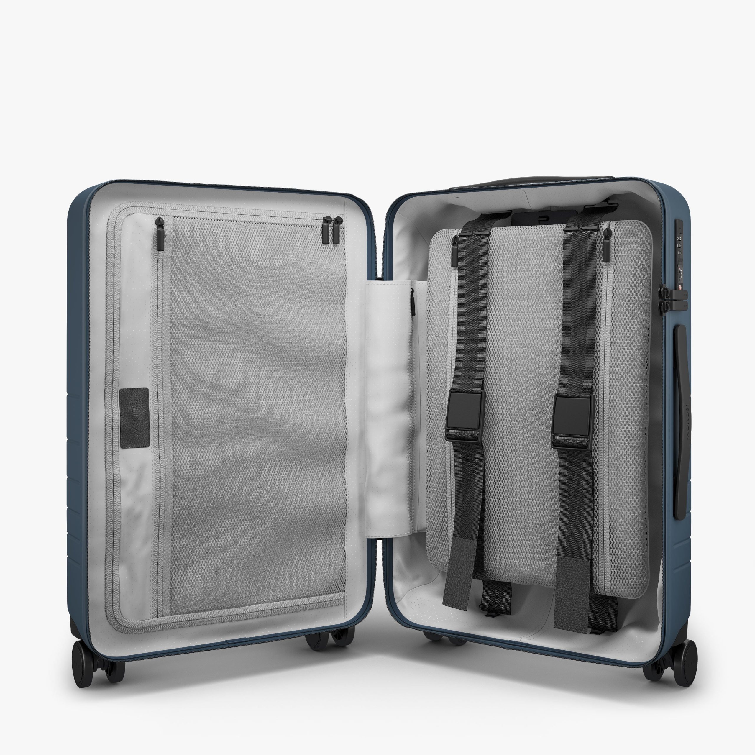 Outfitted with a high-quality polycarbonate shell. the Carry-On Pro is dent-resistant. impact-friendly and virtually unbreakable. It features an ultra-sturdy telescopic handle. TSA-Accepted lock. whisper-quiet wheels. vegan leather details. and all-premium materials. When you’re not travelling. the Carry-On Pro suitcase nests inside any of our Check-In sizes for easy storage.