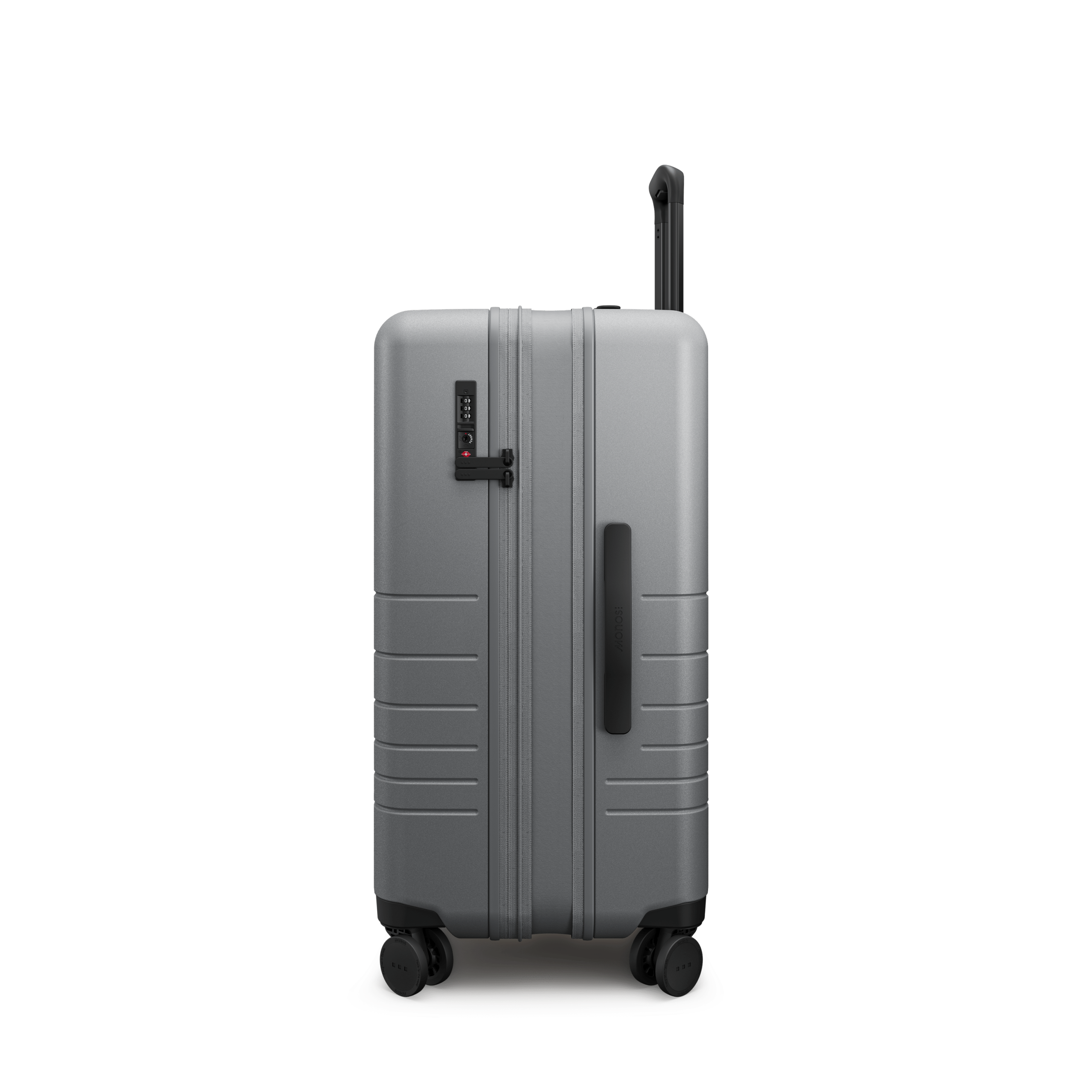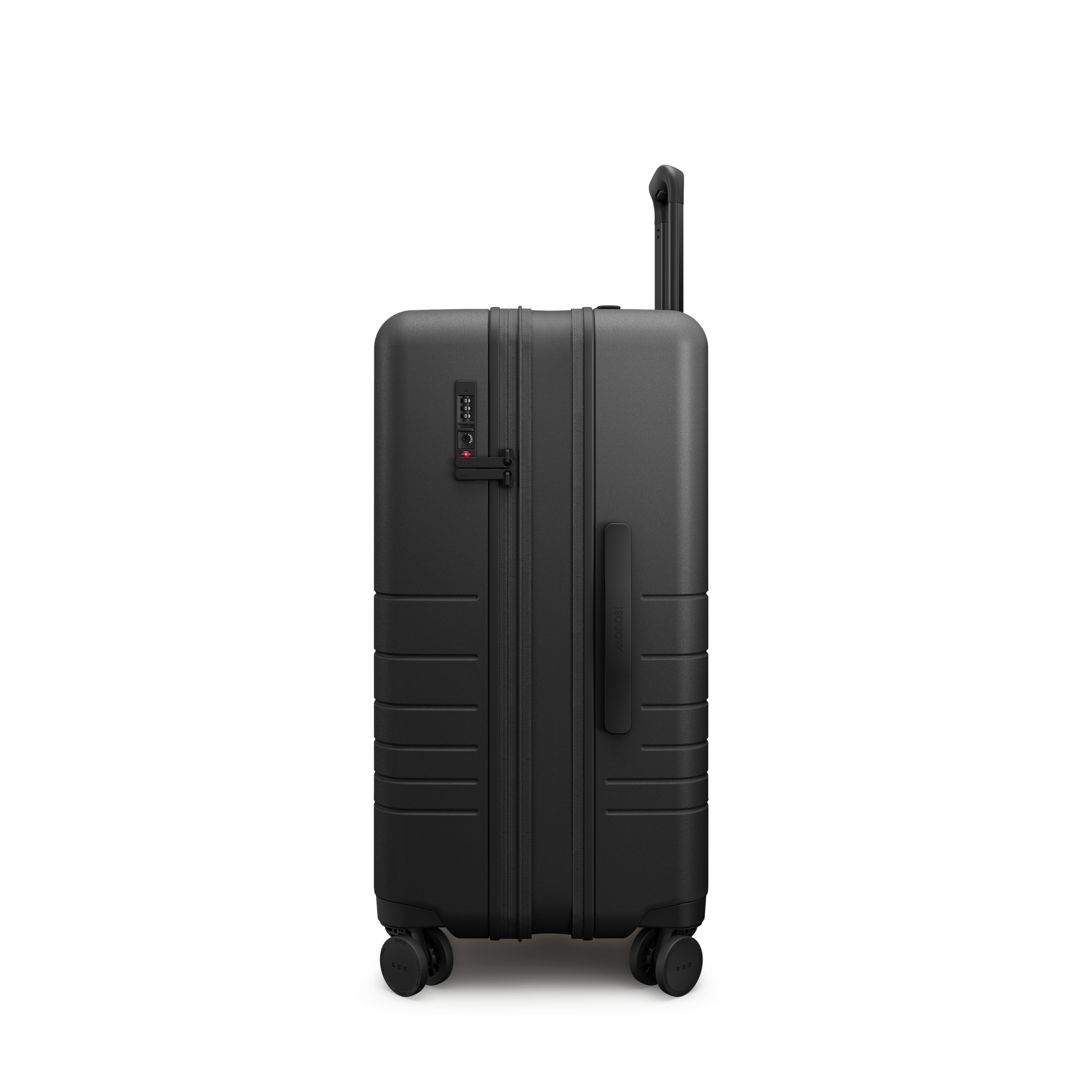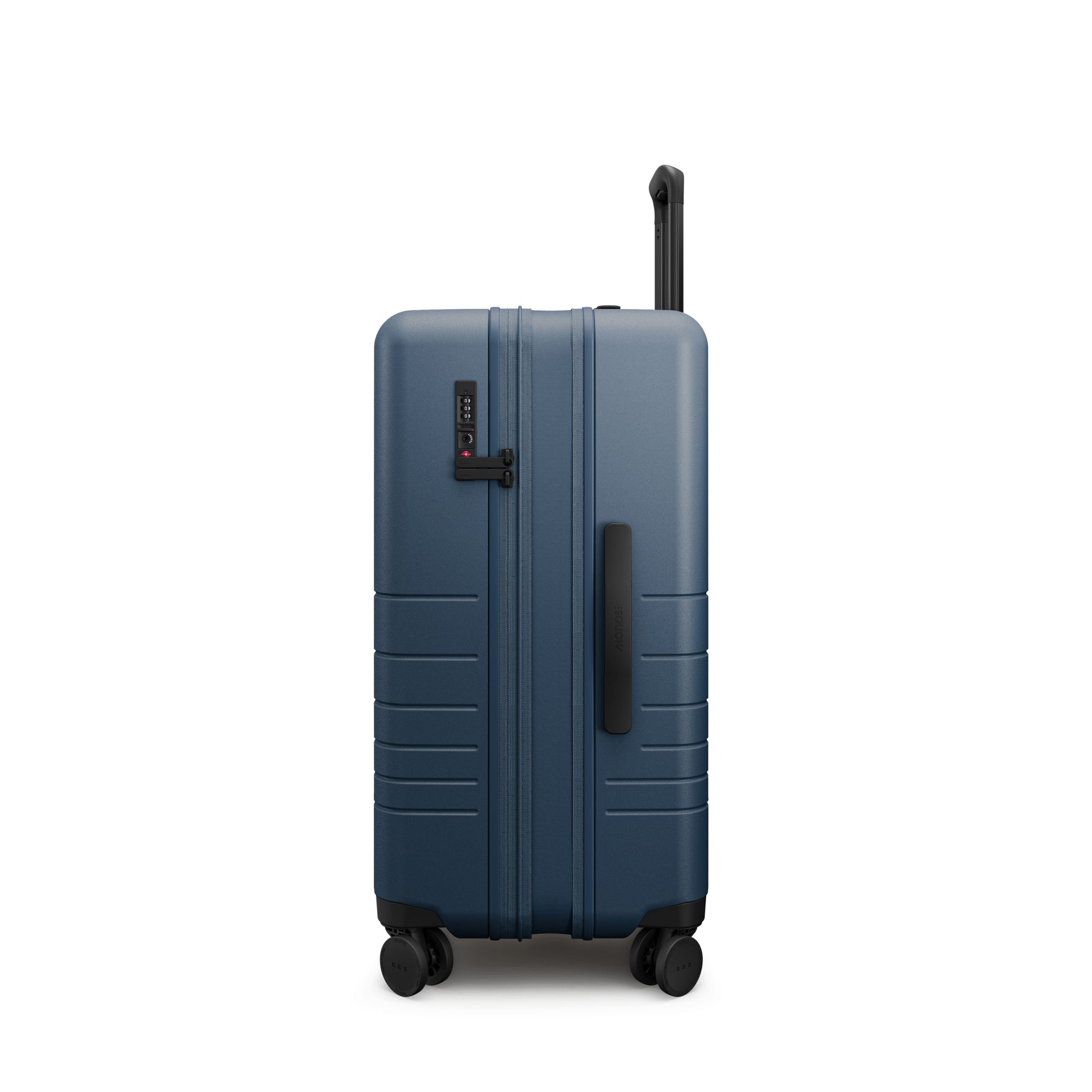 Outfitted with a high-quality polycarbonate shell. the Expandable Check-In Medium is dent-resistant. impact-friendly and virtually unbreakable. It features our new ultra-sturdy telescopic handle. redesigned 57 mm whisper-quiet wheels. TSA-Accepted lock. vegan leather details. and all-premium materials. Any of our carry-on sizes can nest inside for easy storage when you’re not travelling.