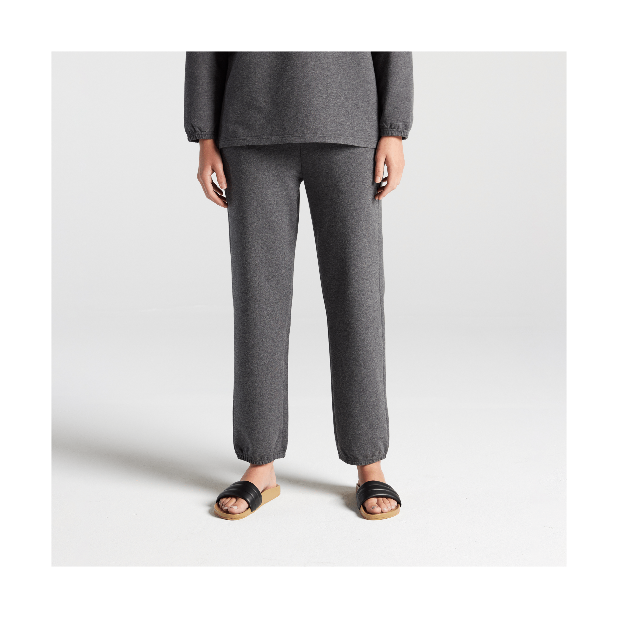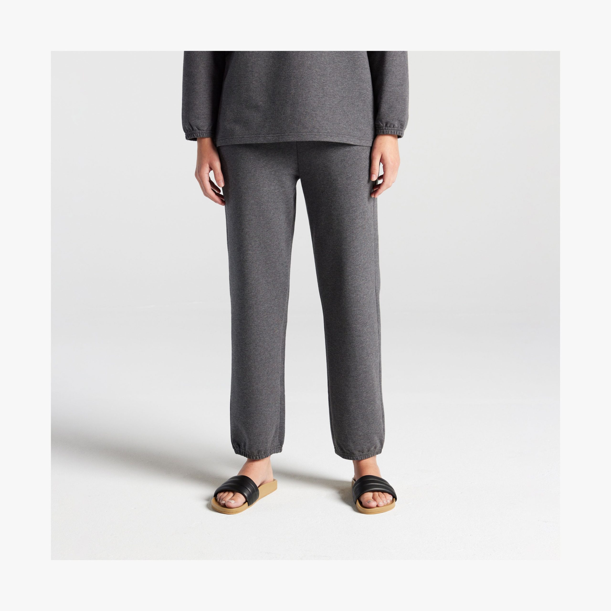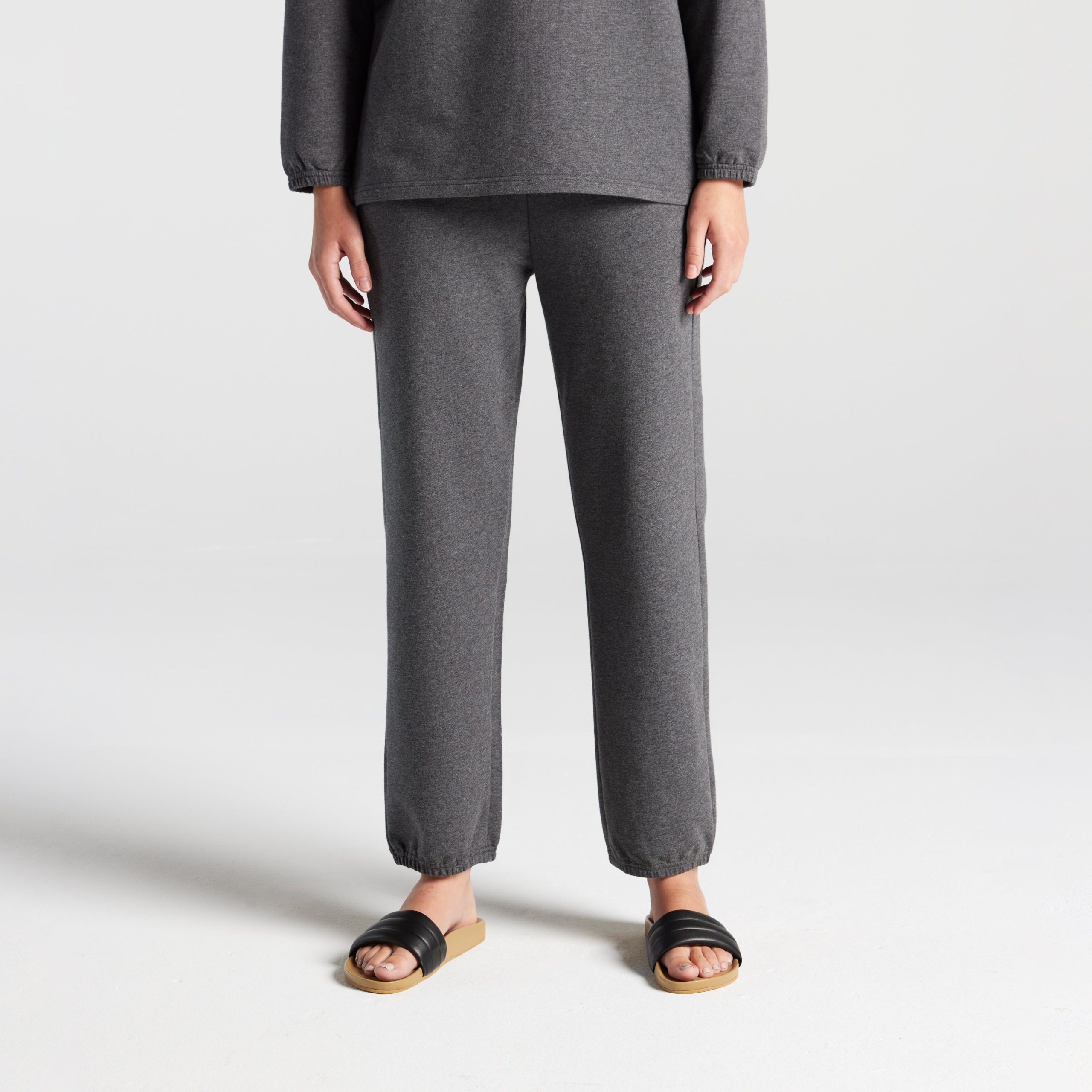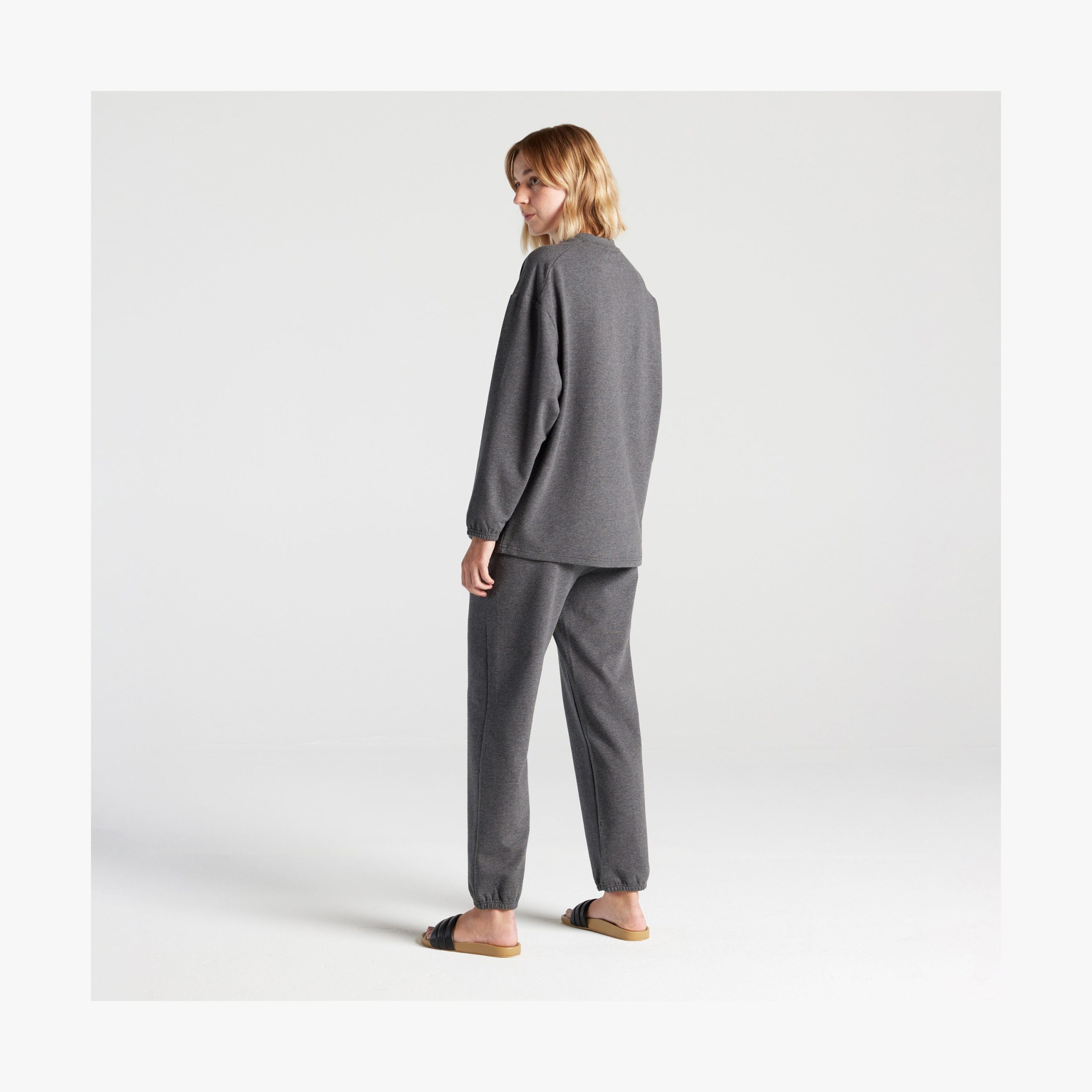 In Heather Charcoal. Miriam is 5’8. wearing size 2 in the top and pants. Deng is 5’10.5. wearing size 2 in the top and pants.